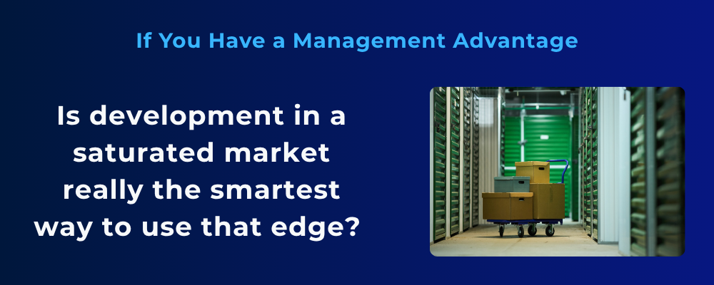 Consider the alternative. You could acquire an existing facility in a market that’s undersupplied or in equilibrium—a market where the fundamentals already support healthy occupancy and rates. Then you apply your operational advantage to a facility that’s already cash-flowing. You’re not fighting for market share in a market you just oversupplied. You’re squeezing incremental revenue out of a stable base through better rate management, better marketing, better customer experience, and better expense control.